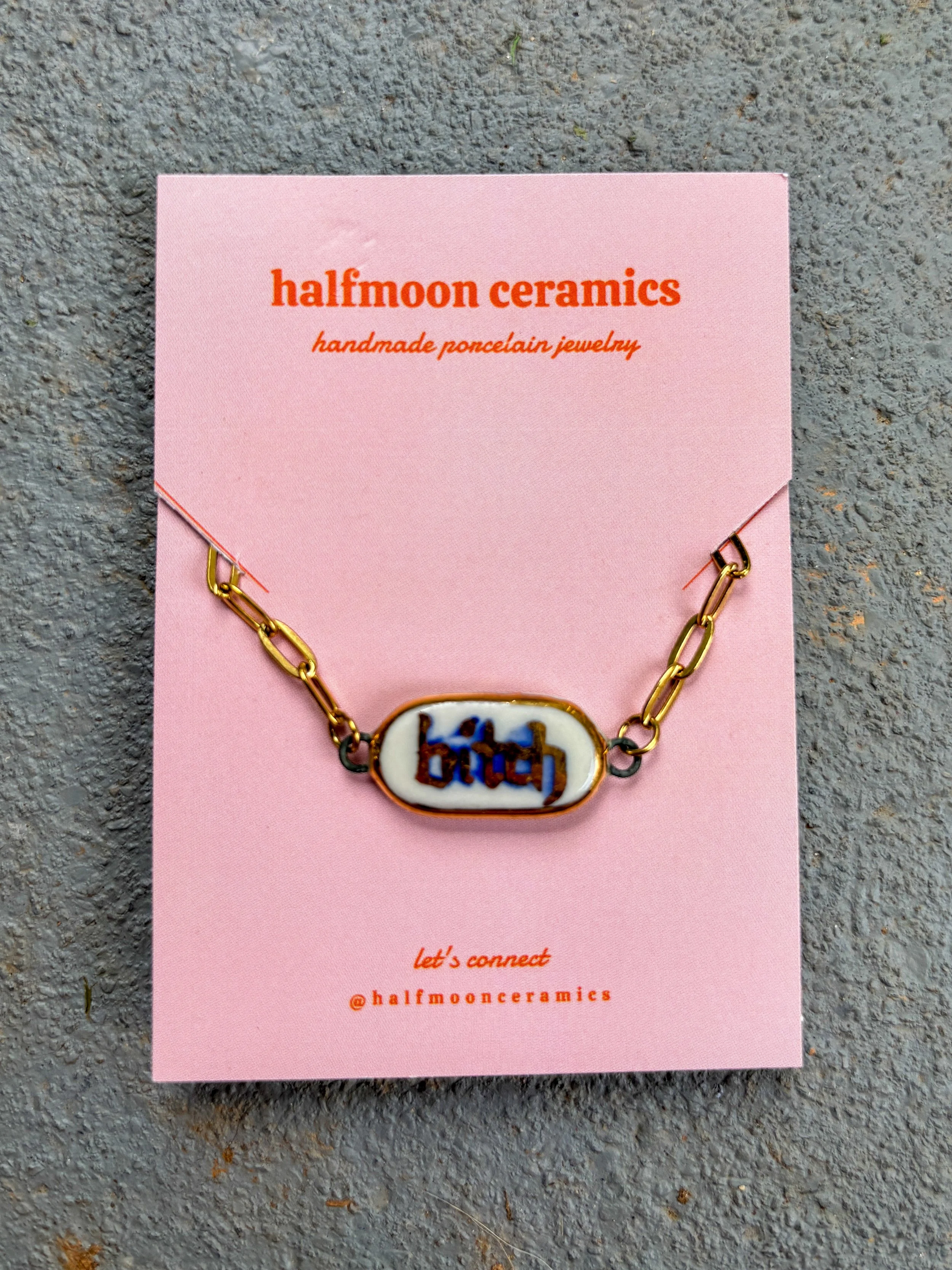 Shop › Bitch Choker - Gold Bitch Choker - Gold $38.00 Made from porcelain clay, blue underglaze, and gold luster. 16 inch paperclip chain with extender. Made from porcelain clay, blue underglaze, and gold luster. 16 inch paperclip chain with extender. Add To Cart Added!