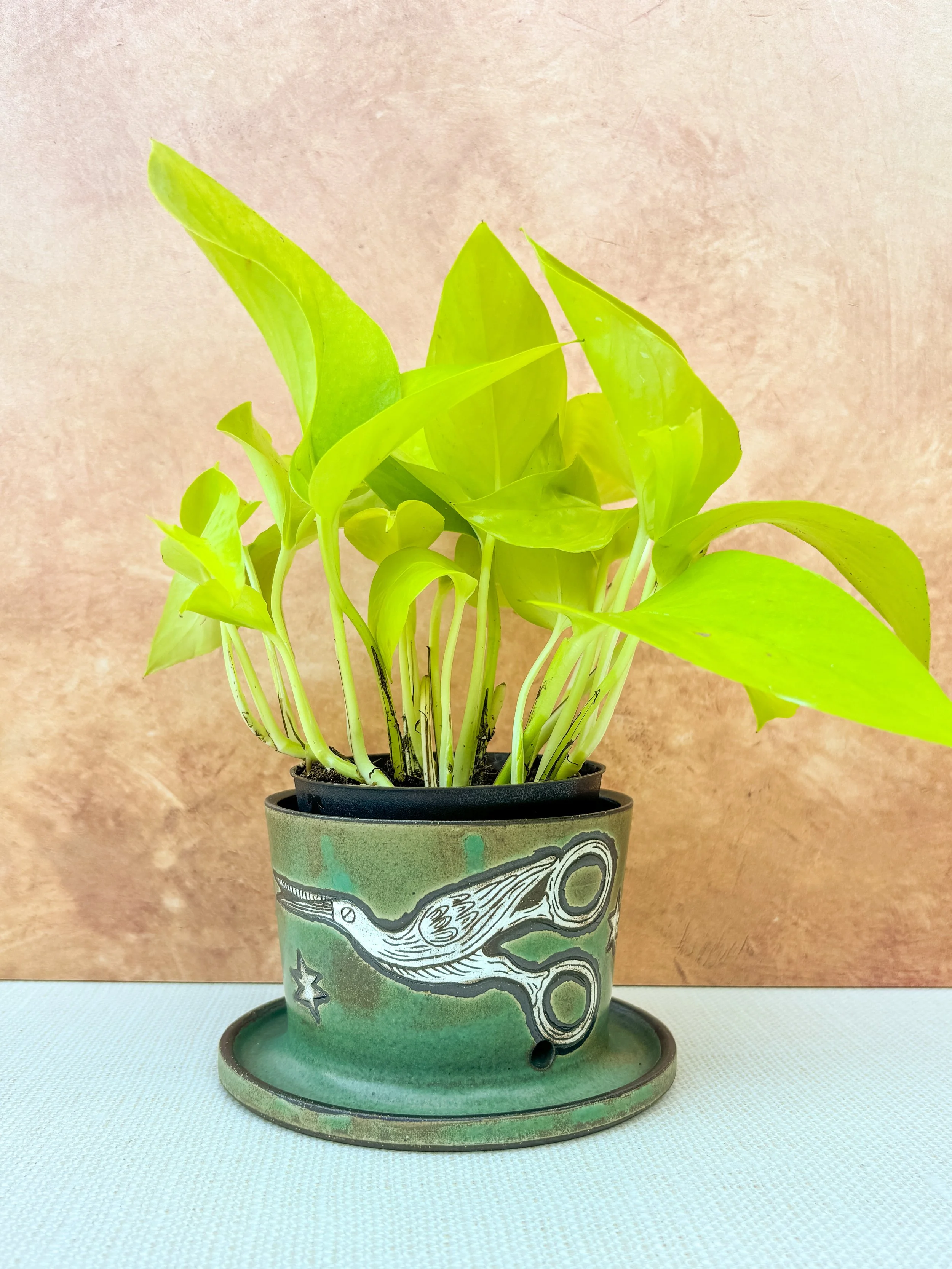 Wheel-thrown ceramic planter with drainage holes. Hand-painted and carved. Created using mid fire clay, underglaze, wax resist, and glaze.