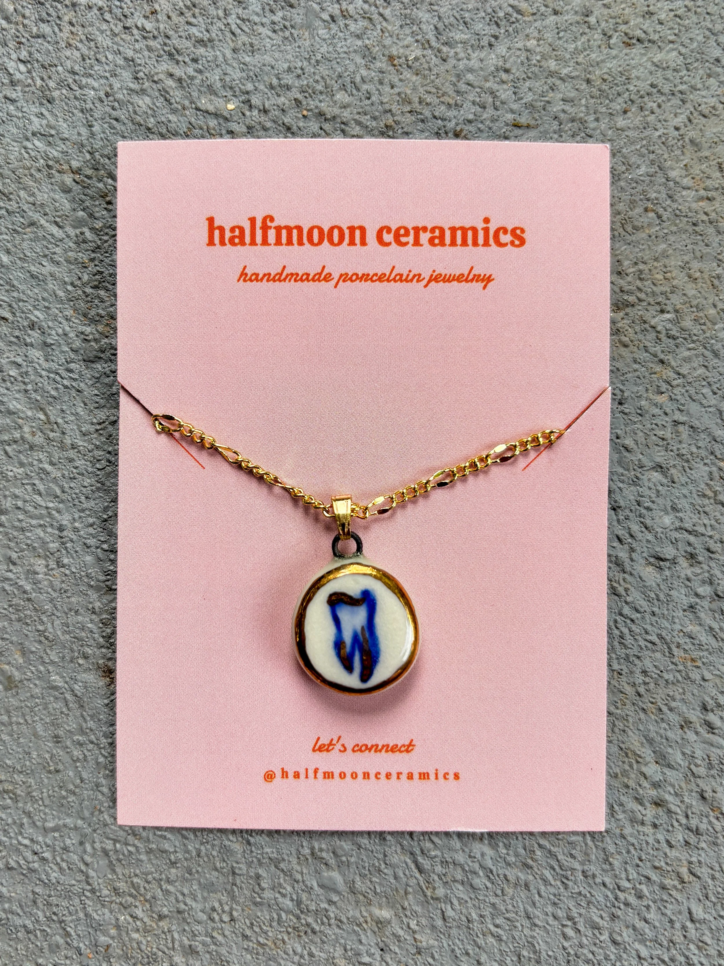 Shop › Tooth Pendant Necklace - Gold Tooth Pendant Necklace - Gold $38.00 Made from porcelain clay, blue underglaze, and gold luster. 18 inch figaro chain. Made from porcelain clay, blue underglaze, and gold luster. 18 inch figaro chain. Add To Cart Added!